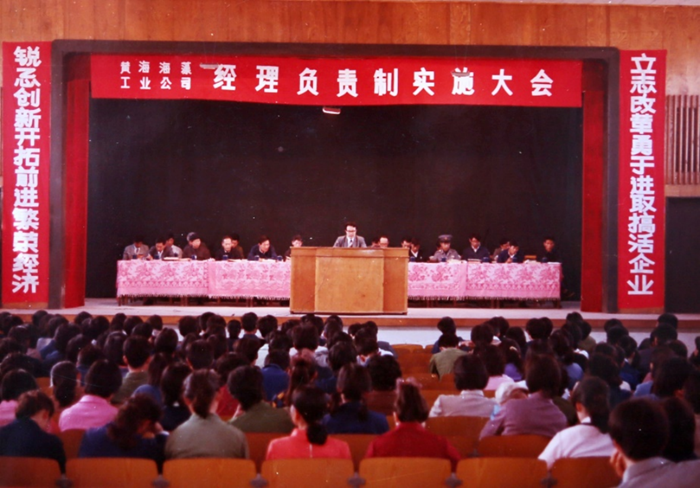 1985年10月,黃海海藻工業公司經理負責制實施大會,時任經理苗深義