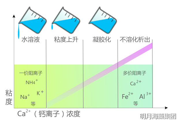 海藻酸銨遇到鈣離子可迅速發生離子交換,生成凝膠,其凝膠具有熱不可逆性。高G型海藻酸鹽生成的凝膠硬度大但易碎;高M型海藻酸鹽生成的凝膠則相反,柔韌性好但硬度小。調整兩種比例可生產不同強度的凝膠。