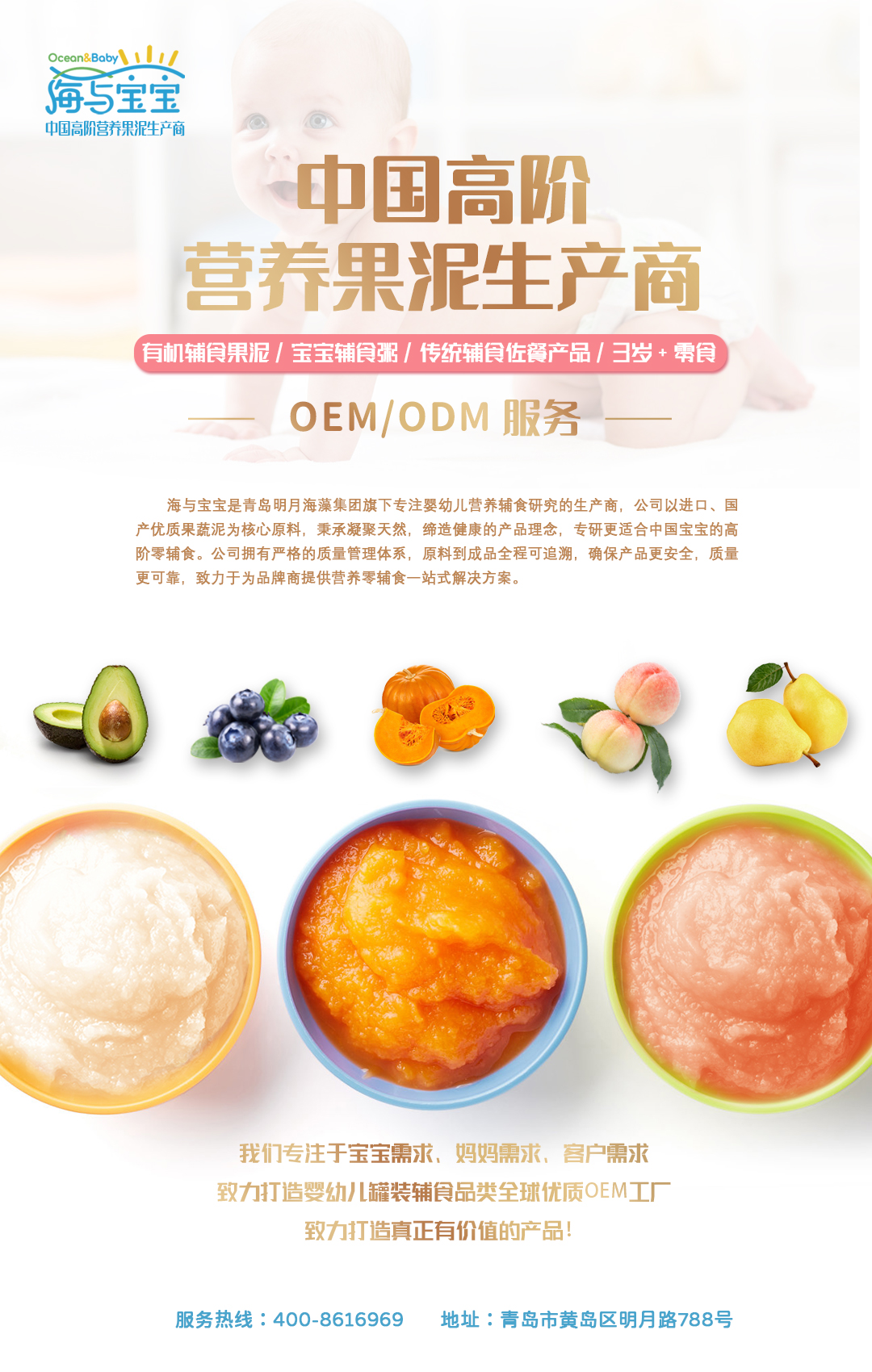 海與寶寶是青島明月海藻集團旗下專注嬰幼兒營養輔食研究的生產商,公司以進口、國產優質果蔬泥為核心原料,秉承凝聚天然,締造健康的產品理念,專研更適合中國寶寶的高階零輔食。公司擁有嚴格的質量管理體系,原料到成品全程可追溯,確保產品更安全,質量更可靠,致力于為品牌商提供營養零輔食一站式解決方案。